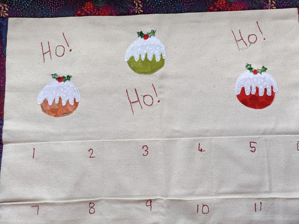 You will be using a free-motion embroidery technique, along with appplique, to apply the decorations. This includes the numbers on each pocket. A choice of designs for the top-piece will be available.
